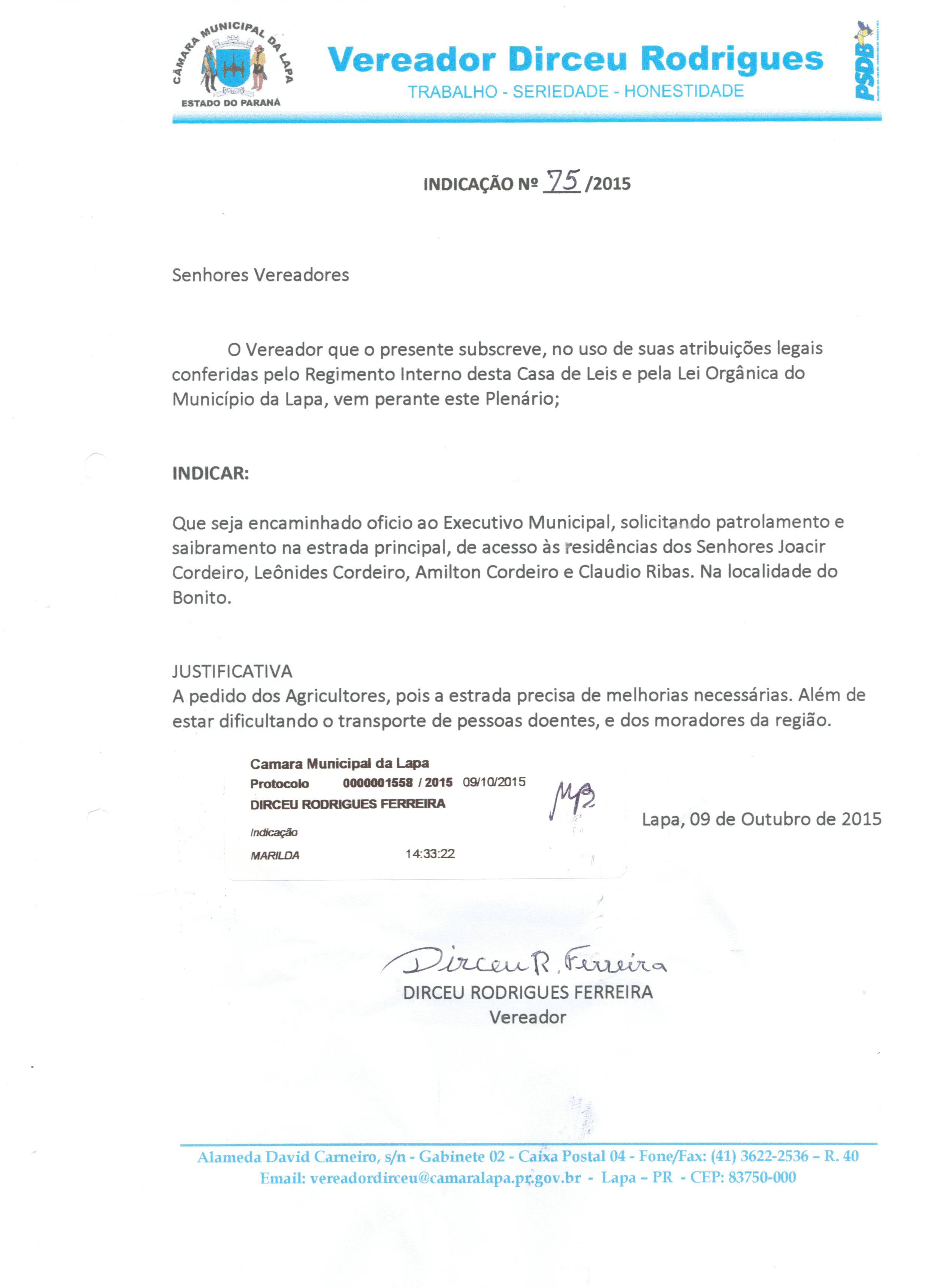 INDICA QUE SEJA ENCAMINHADO OFÍCIO AO EXECUTIVO MUNICIPAL,SOLICITANDO PATROLAMENTO E ENSAIBRAMENTO NA ESTRADA PRINCIPAL,DE ACESSO ÁS RESIDÊNCIAS DOS SENHORES JOACIR CORDEIRO,LEÔNIDES CORDEIRO,AMILTON CORDEIRO E CLAUDIO RIBAS,NA LOCALIDADE DO BONITO. - - INDICA QUE SEJA ENCAMINHADO OFÍCIO AO EXECUTIVO MUNICIPAL,SOLICITANDO PATROLAMENTO E ENSAIBRAMENTO NA ESTRADA PRINCIPAL,DE ACESSO ÁS RESIDÊNCIAS DOS SENHORES JOACIR CORDEIRO,LEÔNIDES CORDEIRO,AMILTON CORDEIRO E CLAUDIO RIBAS,NA LOCALIDADE DO BONITO.