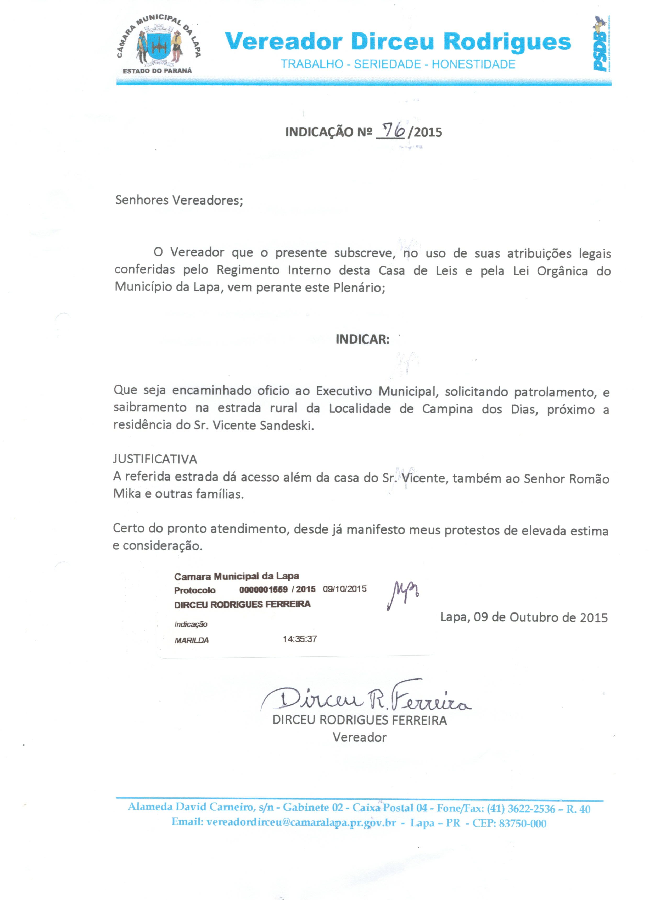 INDICA QUE SEJA ENCAMINHADO OFÍCIO AO EXECUTIVO MUNICIPAL,SOLICITANDO PATROLAMENTO E ENSAIBRAMENTO NA ESTRADA RURAL DA LOCALIDADE DE CAMPINA DOS DIAS,PRÓXIMO A RESIDÊNCIA DO SENHOR VICENTE SANDESKI. - - INDICA QUE SEJA ENCAMINHADO OFÍCIO AO EXECUTIVO MUNICIPAL,SOLICITANDO PATROLAMENTO E ENSAIBRAMENTO NA ESTRADA RURAL DA LOCALIDADE DE CAMPINA DOS DIAS,PRÓXIMO A RESIDÊNCIA DO SENHOR VICENTE SANDESKI.