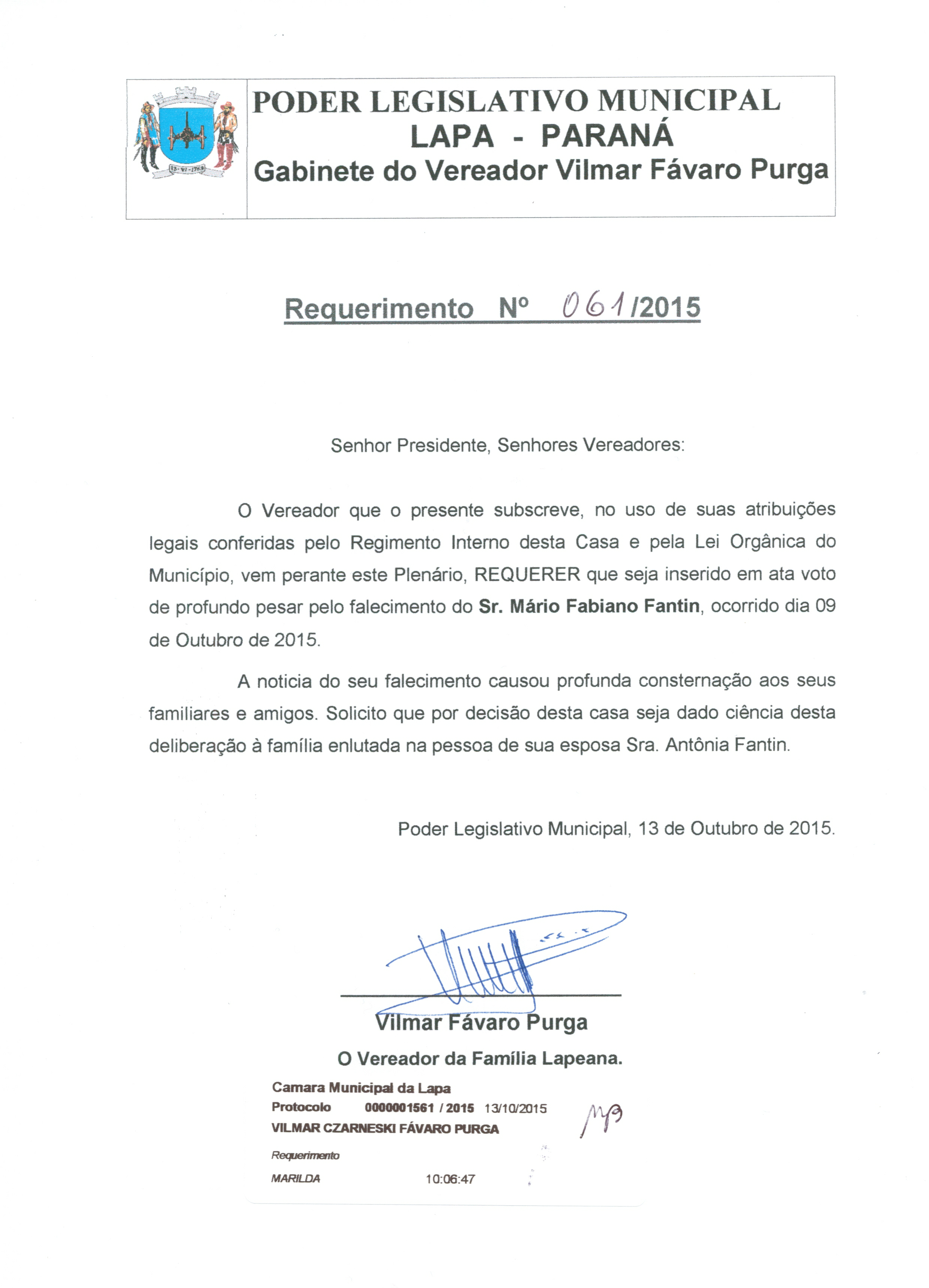 REQUER QUE SEJA INSERIDO EM ATA VOTO DE PROFUNDO PESAR PELO FALECIMENTO DO SENHOR MARIO FABIANO FANTIN,OCORRIDO NO DIA 09 DE OUTUBRO DE 2015. - - REQUER QUE SEJA INSERIDO EM ATA VOTO DE PROFUNDO PESAR PELO FALECIMENTO DO SENHOR MARIO FABIANO FANTIN,OCORRIDO NO DIA 09 DE OUTUBRO DE 2015.